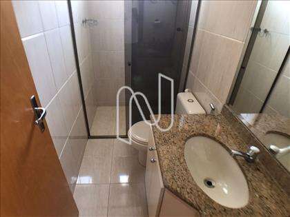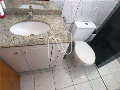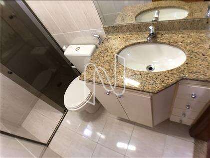 - Banho suíte com piso em cerâmica, paredes azulejadas até o teto, bancada em granito e box blindex, com armários sob bancada;