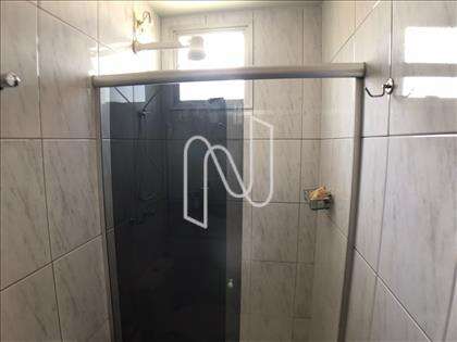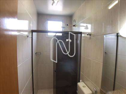- Banheiro social com piso em cerâmica, paredes azulejadas até o teto, bancada em granito e box blindex, com armários sob bancada;