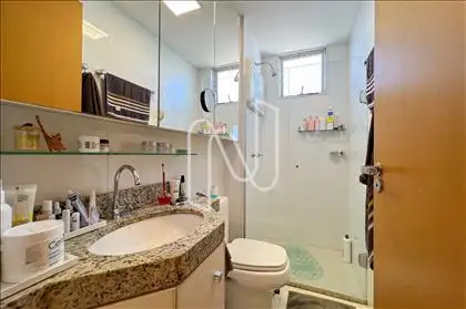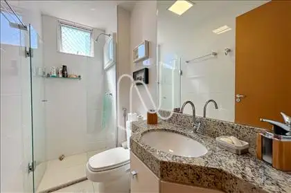 - Banheiro social, armário com espelho e box de vidro;